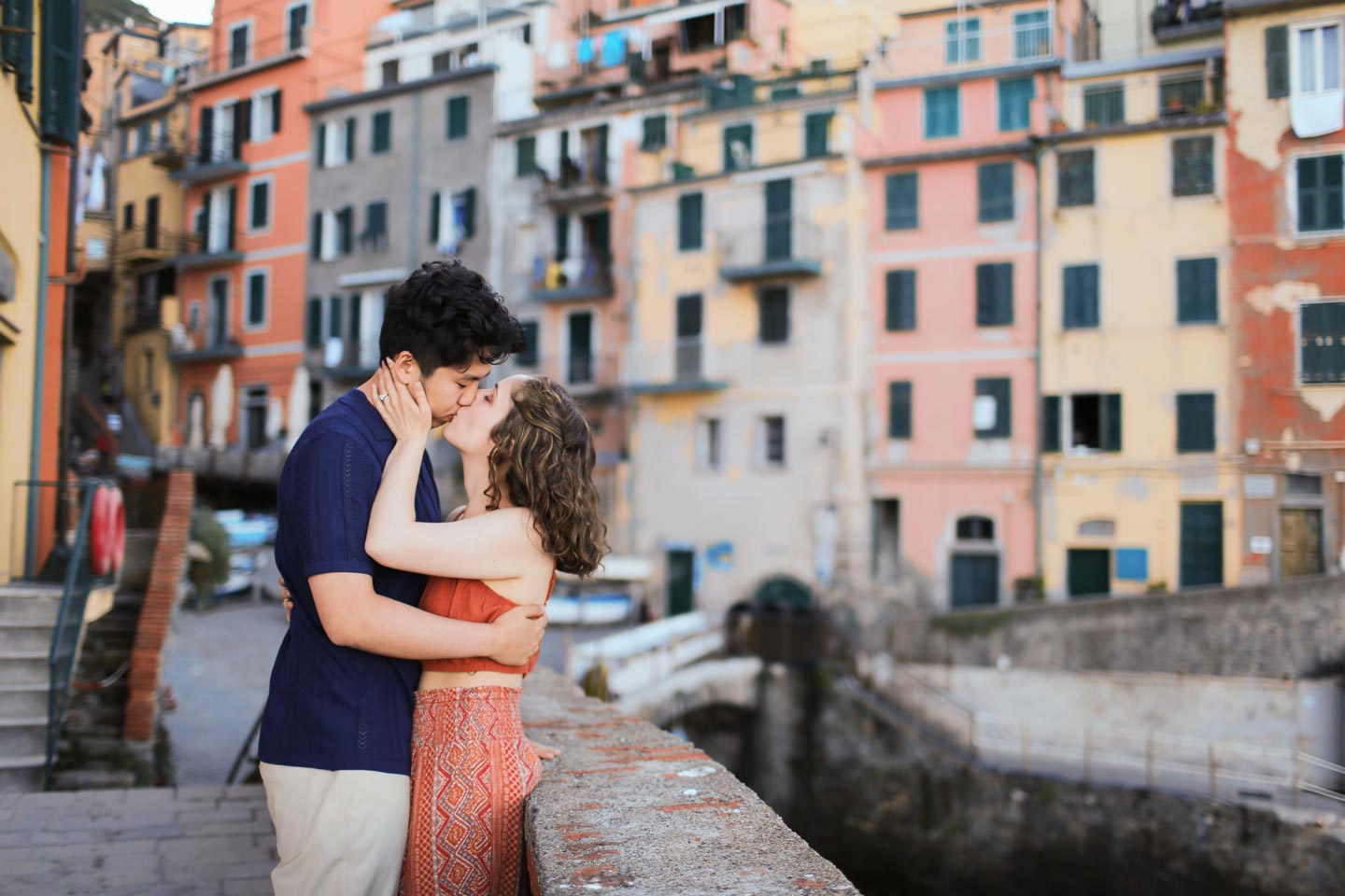 Two-village Marriage proposal session in the Cinque Terre kiss Riomaggiore